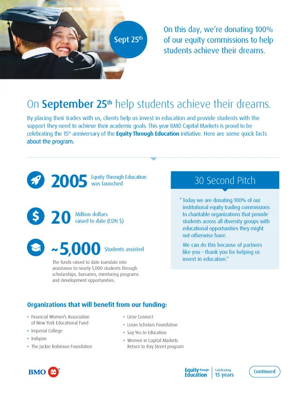 How to promote the 15-year anniversary of Equity Through Education, a charitable initiative in which BMO donates all commissions earned from a single day of trading to organizations promoting equity in education.